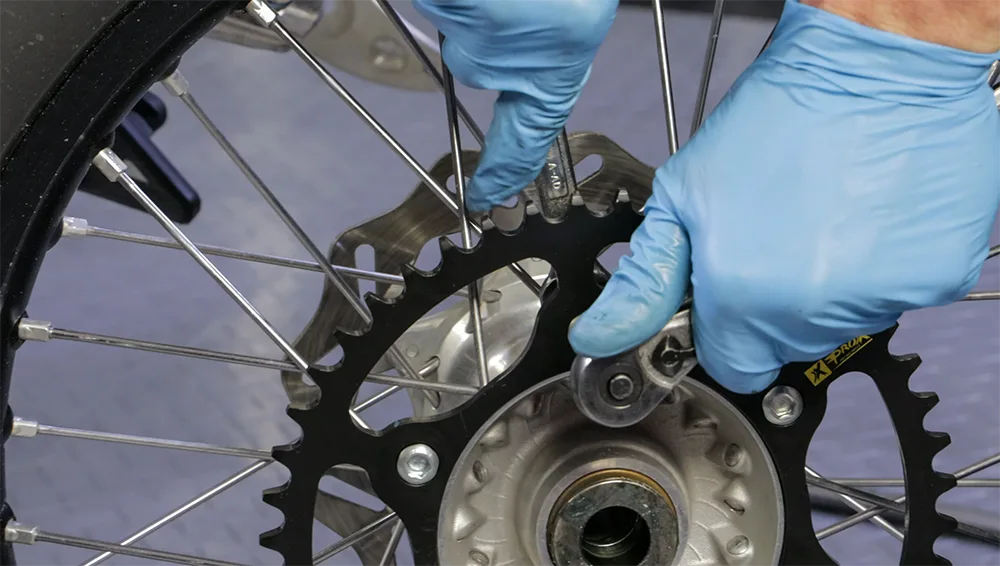 For å se om den talte spenningen er riktig, flikk de andre eikene på rattet og lytt til lyden de lager. Så flick den talen du fikser. Eiker med samme spenning vil gi lignende lyder. Fortsett å justere mutteren til lyden er den samme som de andre eikene, noe som betyr at spenningen er riktig.