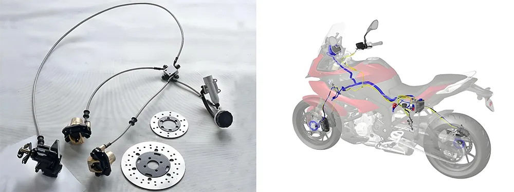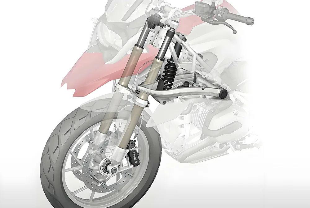 Slik administrerer du direkte sykkelen din - alt du holder på for å styre og stoppe den. På fronten har du styrestammen og styret (eller 'barer') - der du griper og styrer dekket. Så er det kontrollhåndtakene: bremsehåndtaket (foran) og koblingshåndtaket (venstre hånd), pluss bremsepedalen (høyre fot, vanligvis for bakdekket). Kabler og tilkoblinger passerer på trekkene dine, mens den virkelige stoppevnen kommer fra bremsoppsettet - bremser klemmer seg ned på bremsrotorer (eller trommer på noen gamle skolesykler). Og ABS (anti-lock bremsesystem), den viktige sikkerhetsfunksjonen som hindrer hjulene i å låse seg når du virkelig må bremse raskt. Hvis du tar tak i den, kan du gå på den eller lene deg på den for å kontrollere sykkelen, er det en del av dette oppsettet.