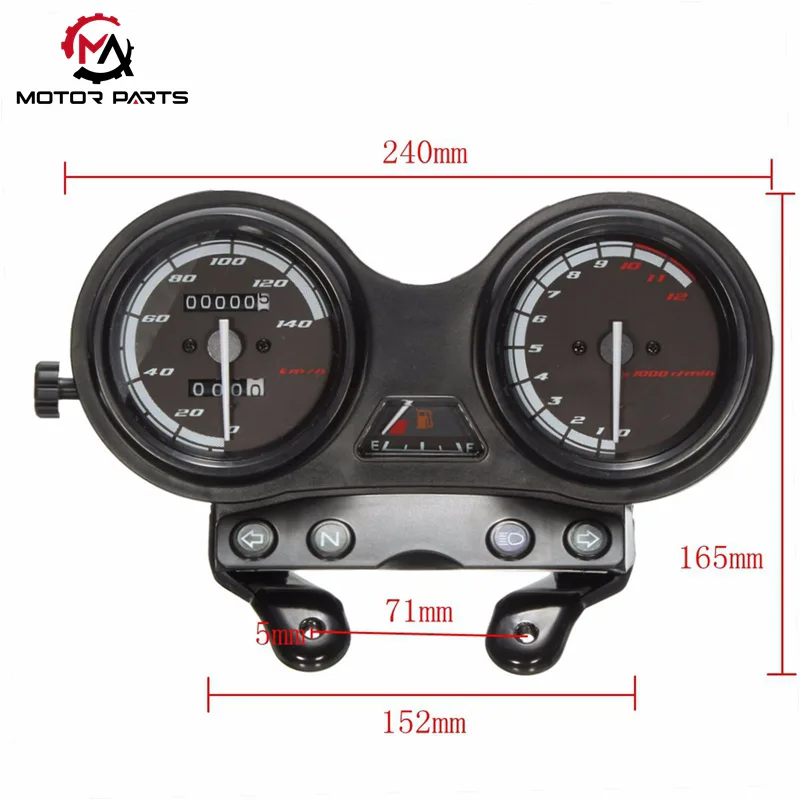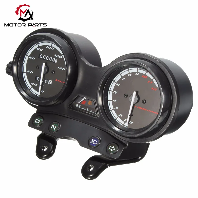 Vår Yamaha YBR125 motorsykkelhastighetsmåler har en "dual-dial uavhengig display"-design, med motorturtelleren til venstre og speedometeret og drivstoffmåleren integrert til høyre. Den krever ingen LCD-skjermmodul, og er helt avhengig av mekaniske pekere og skalaer for å vise data, noe som helt eliminerer behovet for elektroniske komponenter. Som en profesjonell produsent og leverandør av motorsykkeltilbehør, leverer Max Trading stolt Yamaha Yamaha YBR125 Motorsykkel Speedmeter, som har en helmekanisk design med alle peker.